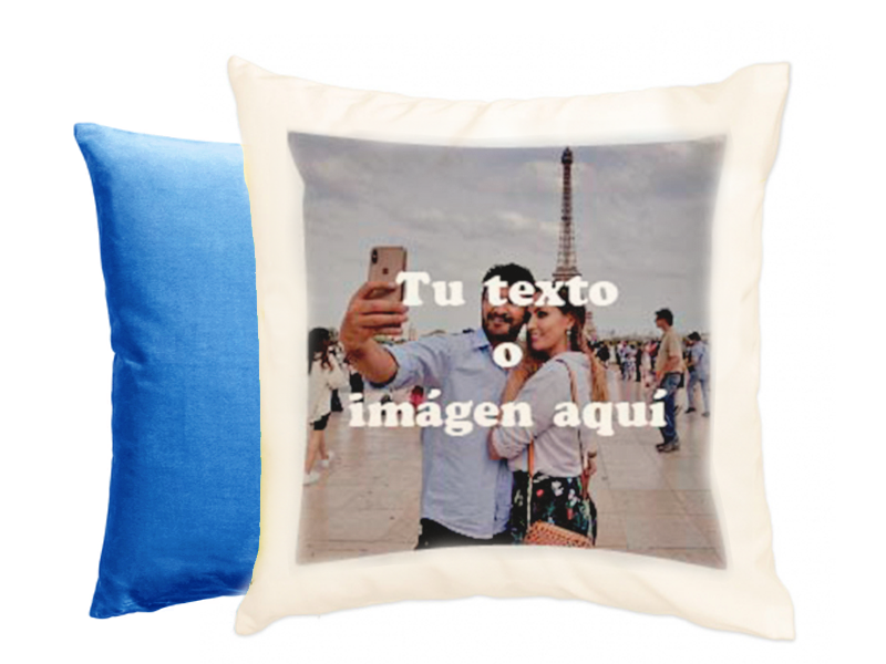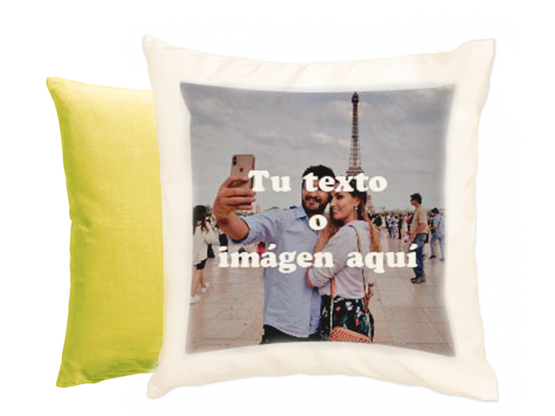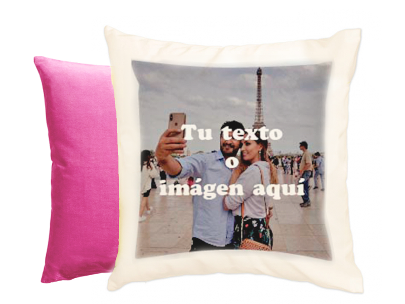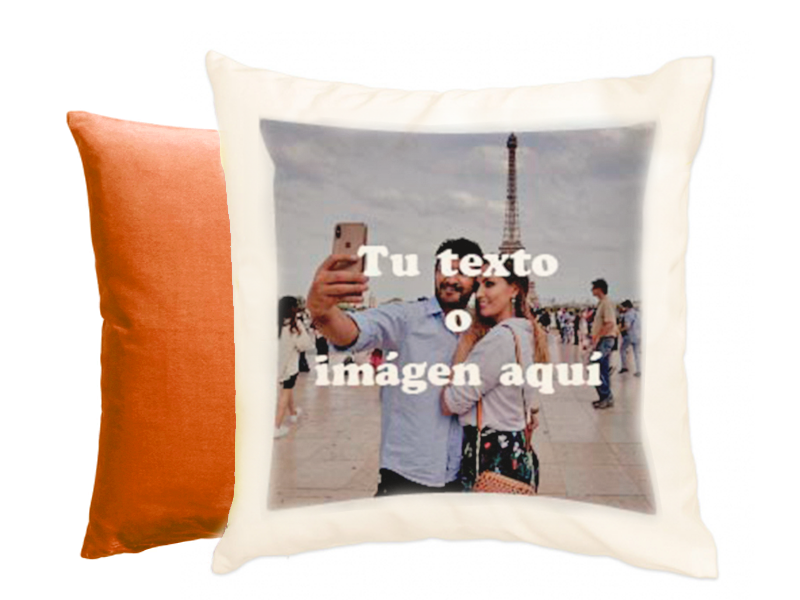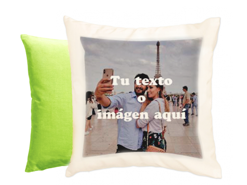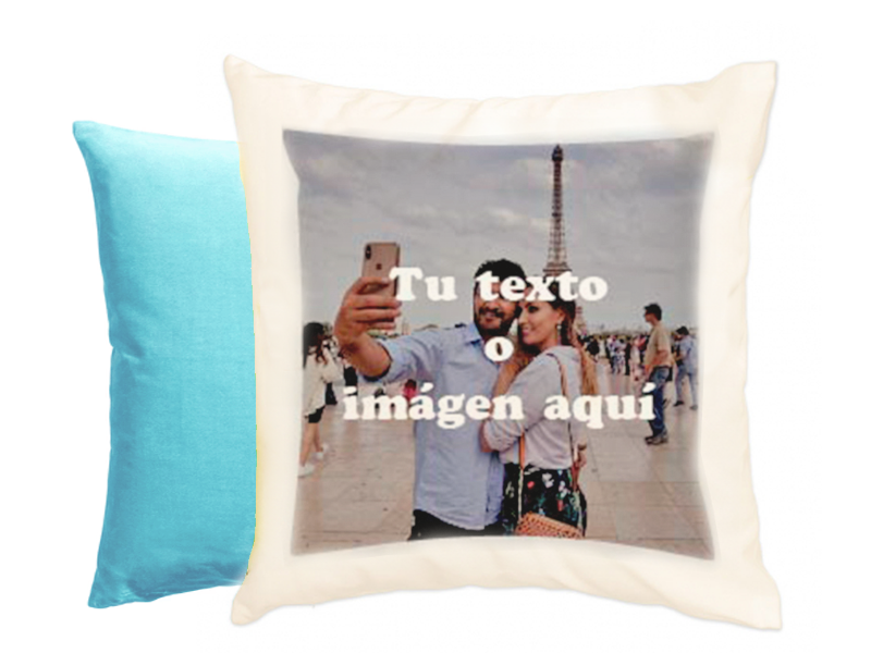 Cojín de terciopelo personalizable con tacto muy suave. Medidas: 40 x 40 cm. Incluye relleno. Material: Poliéster efecto terciopelo. Tamaño máximo de impresión: 29 x 29 cm. o panorámico 29 x 33 cm. Colores: Parte imprimible blanca. trasera: blanca, azul claro, azul oscuro, verde oscuro, verde claro, amarillo, naranja, rosa y fucsia. Precio: Personalizado a 1 cara 20€ a 2 caras (solo trasera blanca): 25€